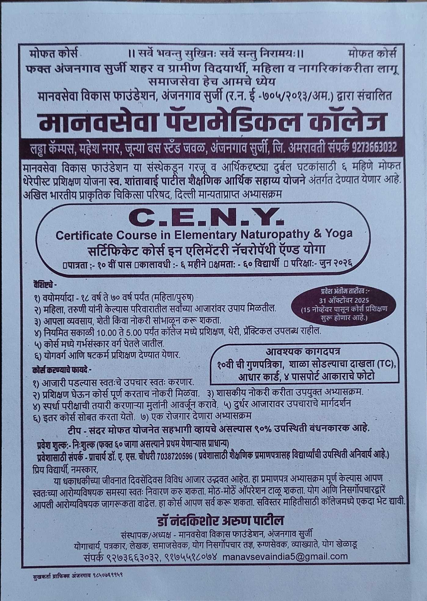 या धकाधकीच्या जीवनात दिवसेंदिवस विविध आजार उद्भवत आहेत. हा प्रमाणपत्र अभ्यासक्रम पूर्ण केल्यास आपण स्वतःच्या आरोग्यविषयक समस्या स्वतः निवारण करु शकता. मोठ-मोठे ऑपरेशन टाळू शकता. योग आणि निसर्गोपचारद्वारें आपली आरोग्यविषयक जागरूकता वाढेल. हा कोर्स आपण सर्व करू शकता. सविस्तर माहितीसाठी कॉलेजमध्ये एकदा भेट द्यावी.